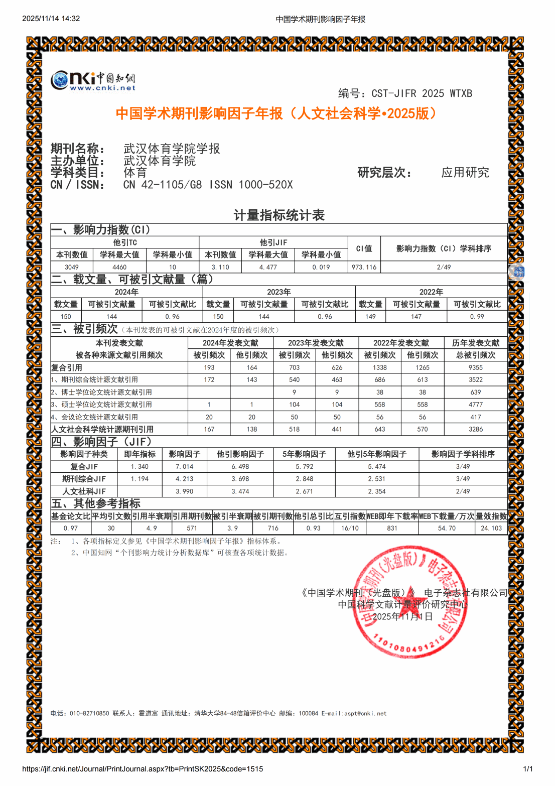 近日,《中国学术期刊(光盘版)》电子杂志社有限公司、中国科学文献计量评价研究中心联合发布了《中国学术期刊影响因子年报(人文社会科学•2025版)》,《武汉体育学院学报》和《体育教育学刊》的学科影响力再创新高,分列学科排名第2位和第17位。其中,《武汉体育学院学报》的影响力指数从去年的931.272提升至973.116,影响因子从去年的5.964提升至7.017;《体育教育学刊》的影响力指数从去年的186.512提升至196.599,影响因子从去年的2.625提升至3.242。